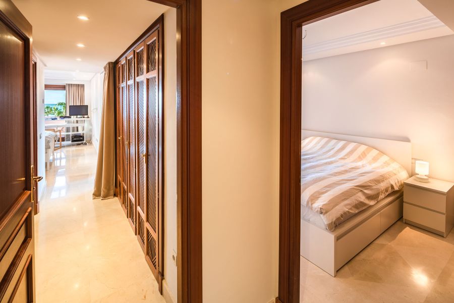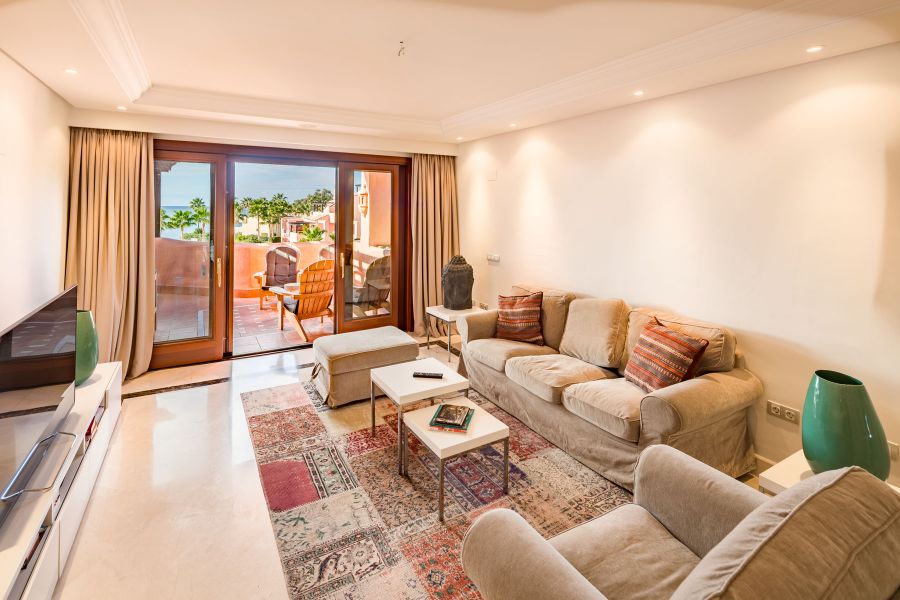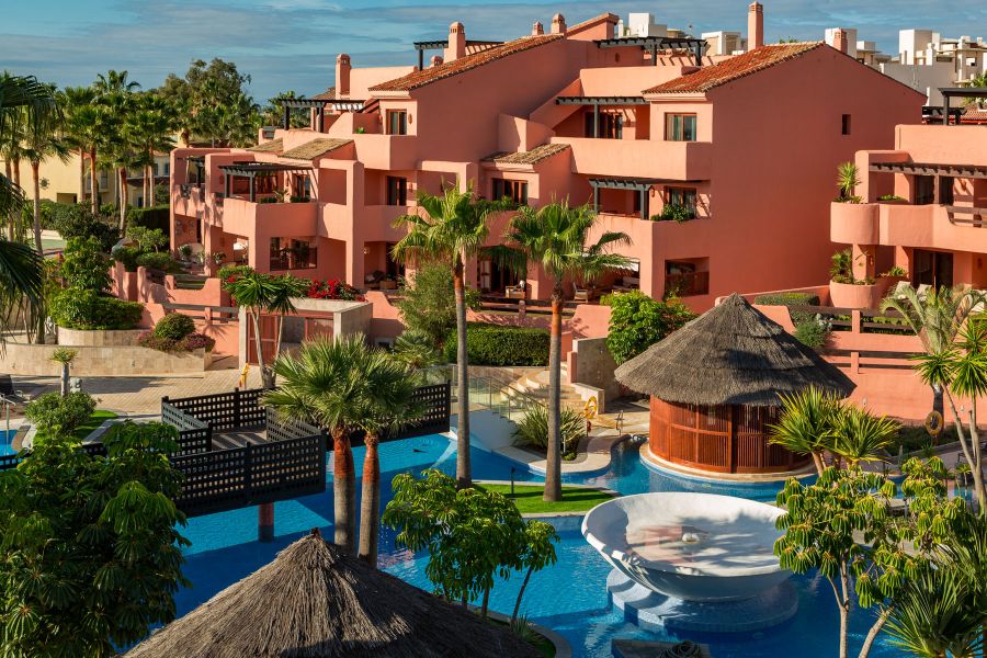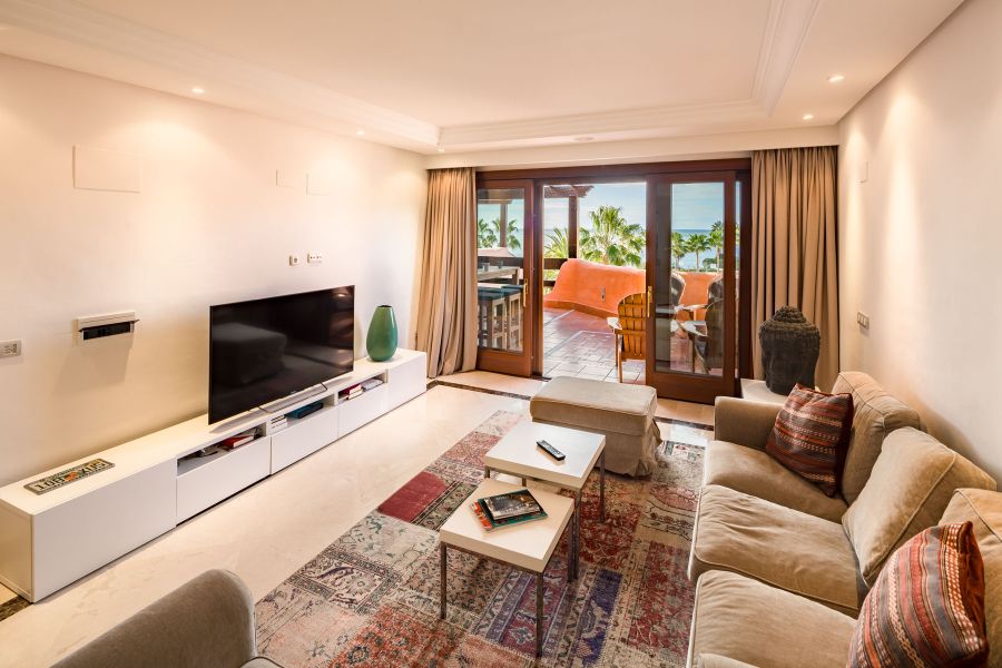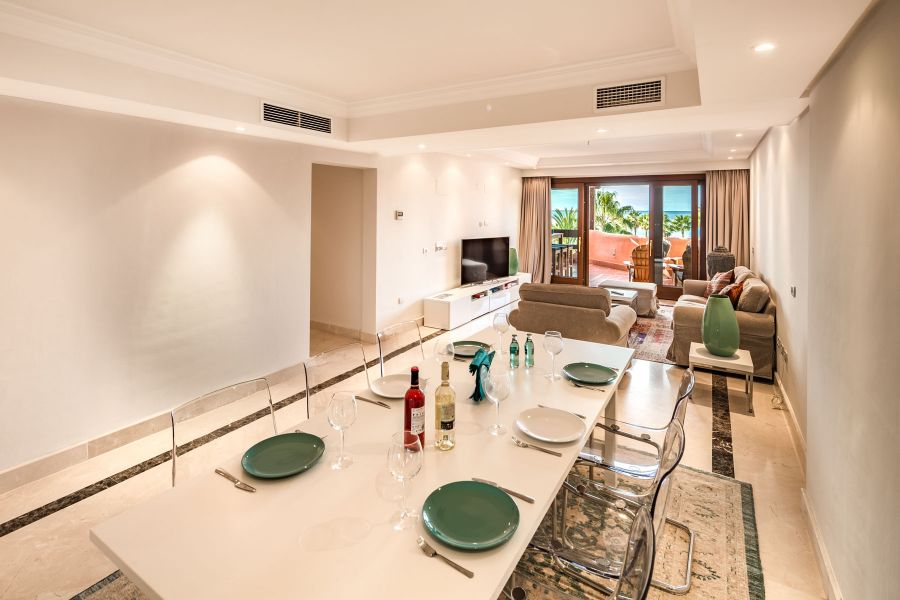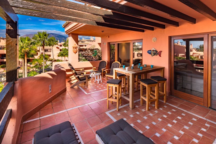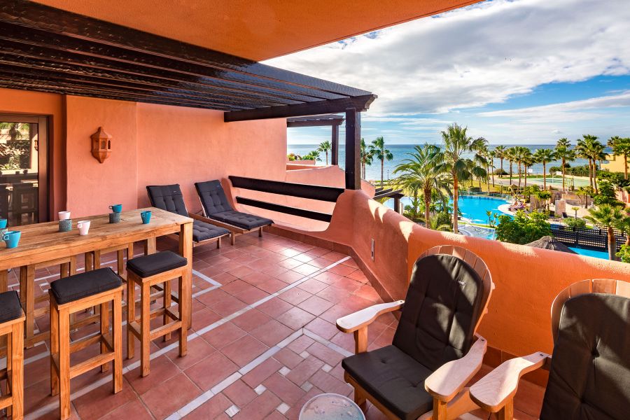 Complejo de primera línea de playa con jardines tropicales, cerca del hotel Kempinski y Laguna Village con sus tiendas, restaurantes y playas espectaculares. Justo enfrente del pueblo de Laguna hay un supermercado Aldi. Complejo consiste de un club de ocio y zona de recepción, gimnasio, bar-cafetería junto a la piscina, piscina cubierta climatizada, una hermosa piscina con islas tropicales.. El atico tiene vistas abiertas al Mar Mediterraneo y la zona de jardines y piscinas, dispone de 3 dormitorios y 2 baños de los cuales el dormitorio principal tiene su propio baño en suite y los otros 2 dormitorios comparten 1 baño. Hay una cocina totalmente equipada, una sala de estar bien amueblada con comedor, TV vía satélite y equipo de música moderna. Incluye parking para un coche y trastero.