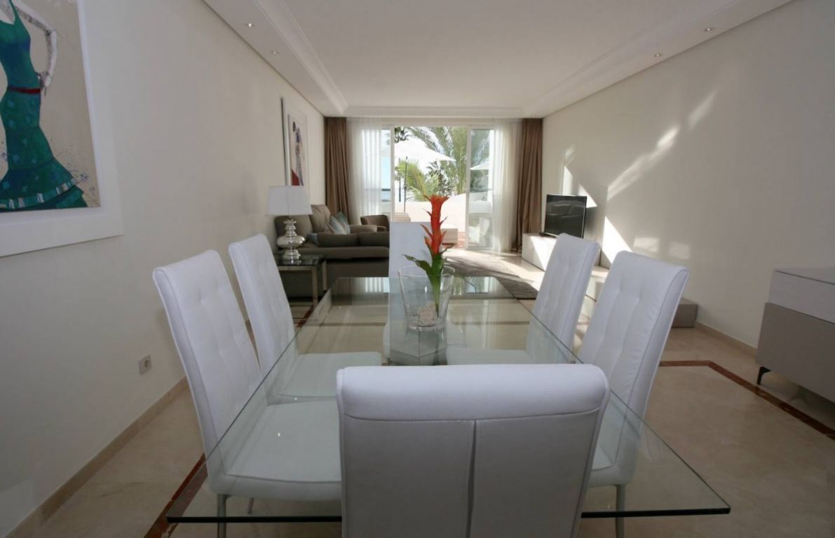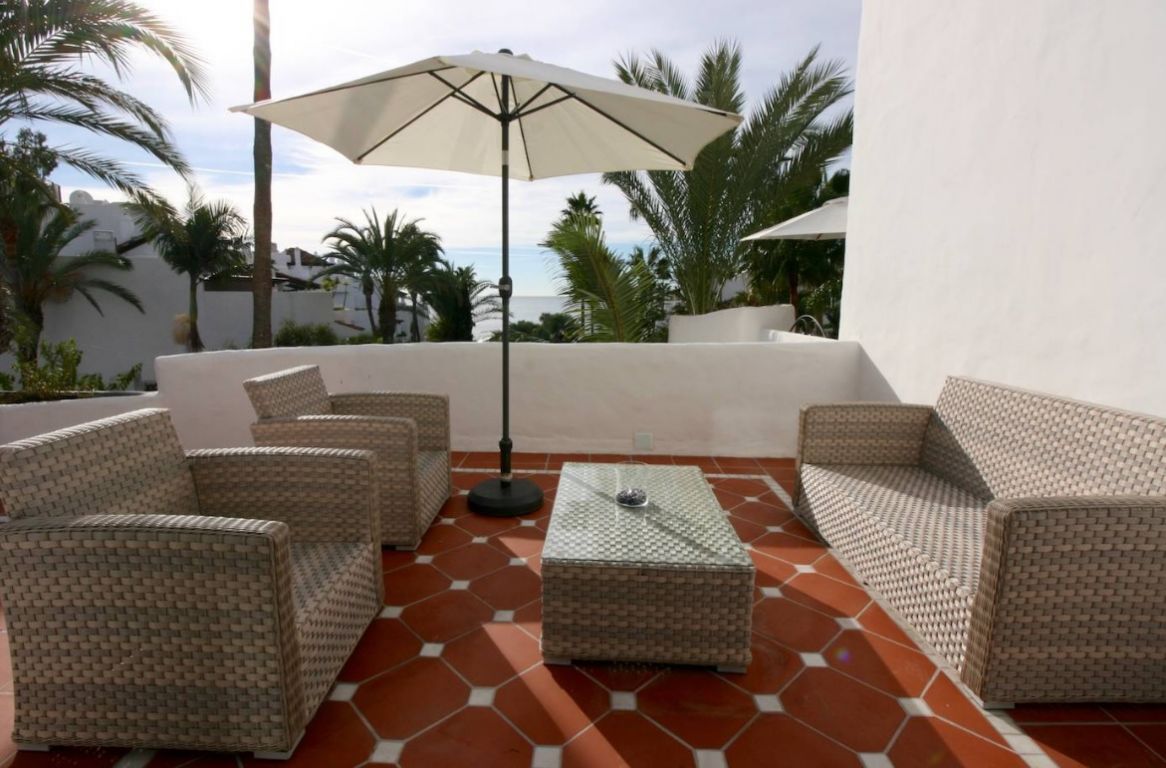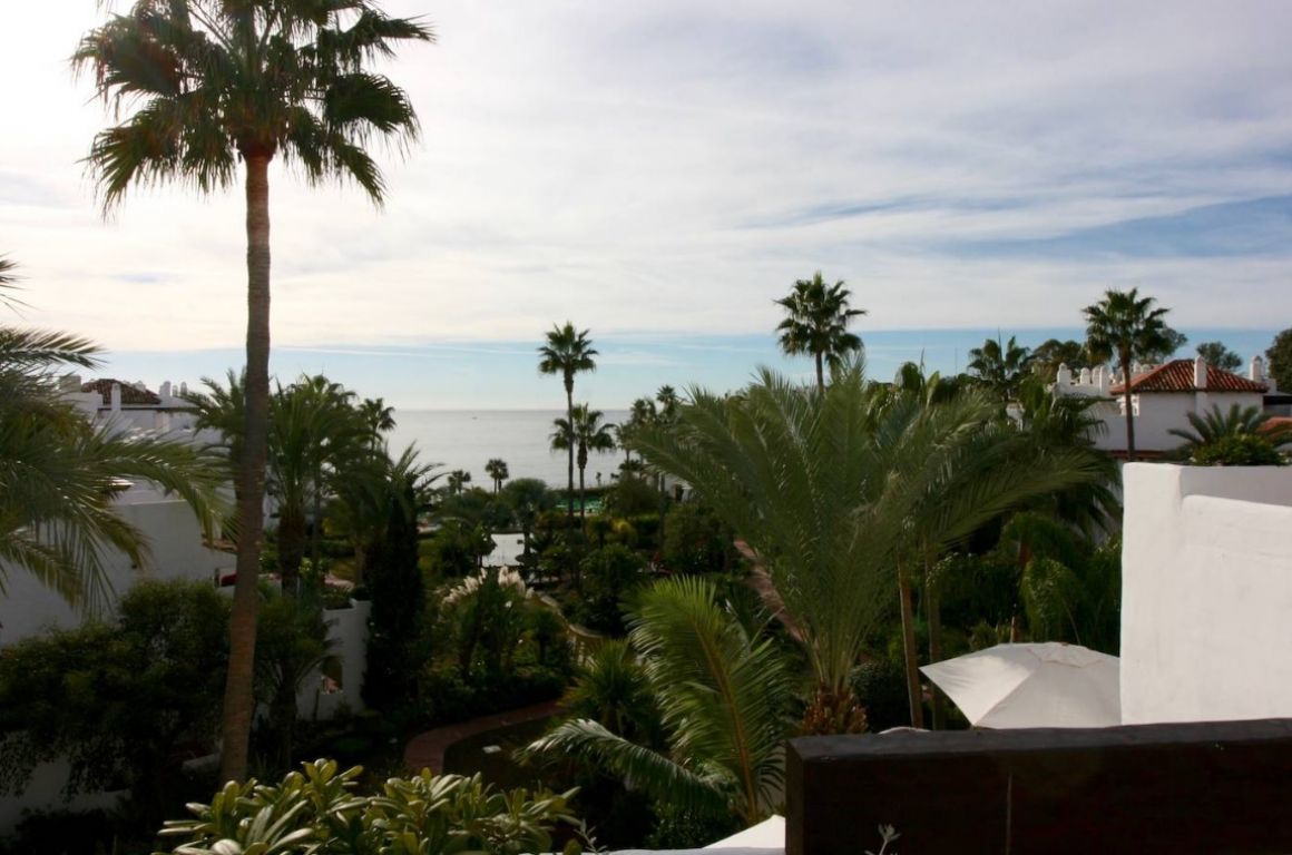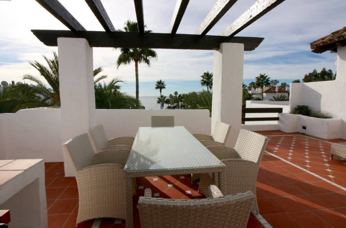 Maravilloso ático dúplex con vistas frontales al mar en una de las más prestigiosas urbanizaciones en primera línea de playa en Puerto Banús (Marbella). . El complejo ofrece un excelente nivel de seguridad, jardines tropicales con riachuelos, estanques y zona de piscina, gimnasio, Spa (sauna, baño de vapor, duchas), área de juegos y de salón con cafetería, acceso directo al paseo marítimo y la playa. . . La propiedad ha sido amueblada a altos estándares y consta de: gran salón-comedor con acceso a una amplia terraza orientada al sur, con vistas a los jardines y al mar; cocina completamente equipada; zona de lavadero y despensa; dos dormitorios en planta principal, uno con cama de ‘King Size’ y baño incorporado y el otro con dos camas individuales y baño separado; dormitorio principal en planta alta con cama ‘King Size’, baño y vestidor contiguo y acceso a amplias terrazas con zona de barbacoa y solárium, que ofrece vistas privilegiadas desde el centro del complejo. Suelos y baños son de mármol. Incluye 2 plazas de garaje en el garaje subterráneo. . El apartamento dispone de aire acondicionada (frío/calor) en todas las estancias, de cerradura eléctrica en la puerta principal y sistema de alarma, caja fuerte, internet de fibra óptica con WiFi en todo el piso y 2 TV LED inteligentes de 50 pulgadas. . Un fabuloso piso de lujo, ¡a sólo unos pasos del mar y de Puerto Banús!