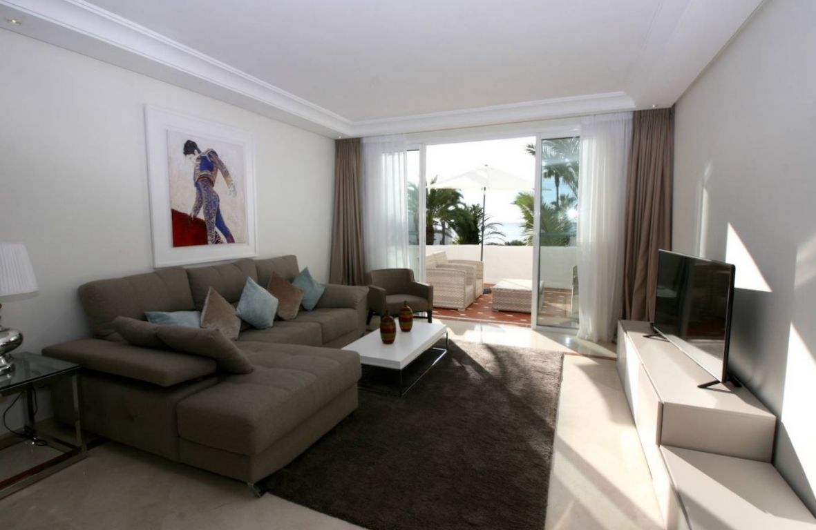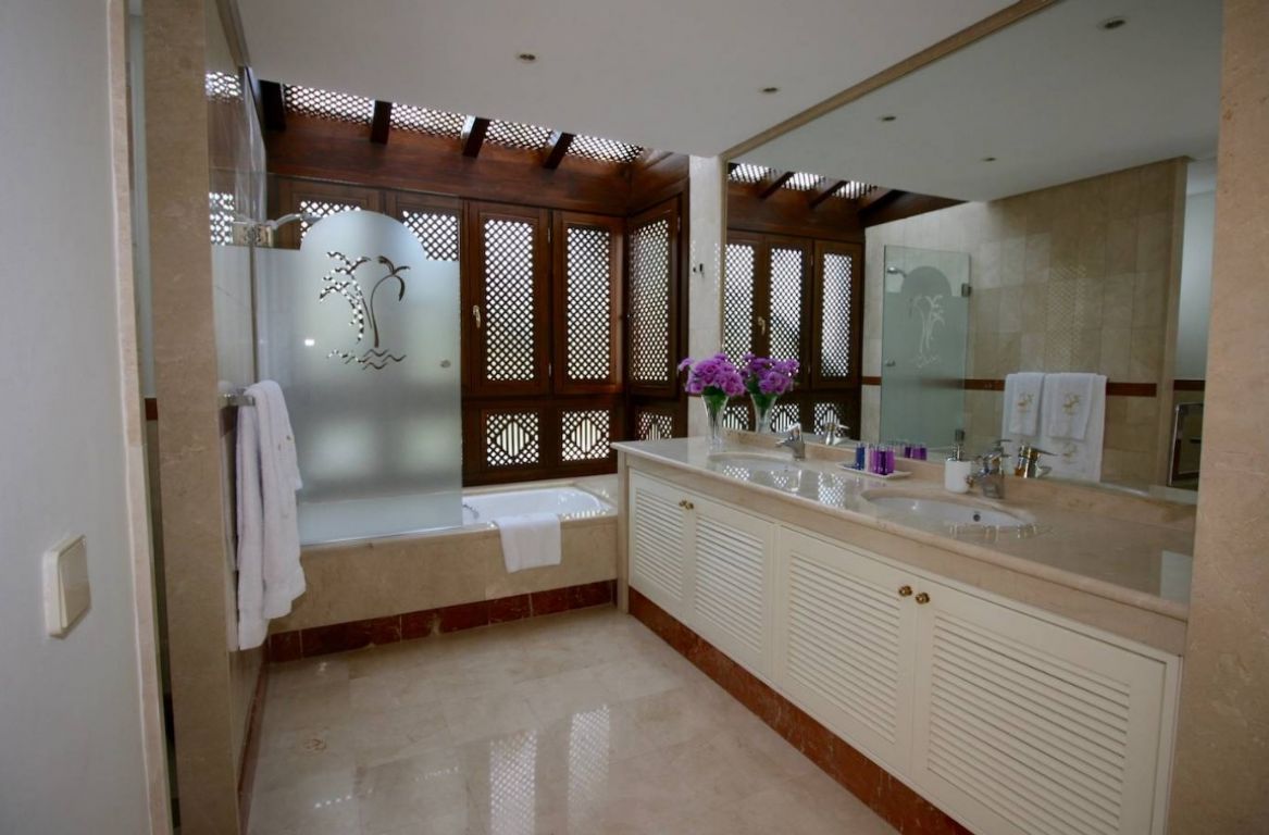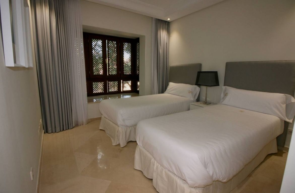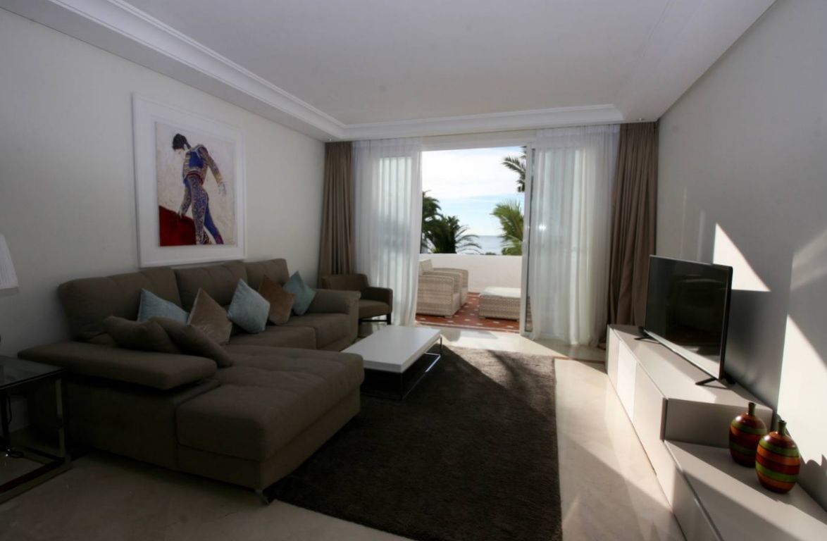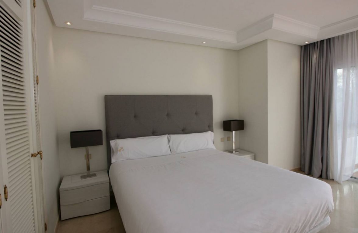 Maravilloso ático dúplex con vistas frontales al mar en una de las más prestigiosas urbanizaciones en primera línea de playa en Puerto Banús (Marbella). . El complejo ofrece un excelente nivel de seguridad, jardines tropicales con riachuelos, estanques y zona de piscina, gimnasio, Spa (sauna, baño de vapor, duchas), área de juegos y de salón con cafetería, acceso directo al paseo marítimo y la playa. . . La propiedad ha sido amueblada a altos estándares y consta de: gran salón-comedor con acceso a una amplia terraza orientada al sur, con vistas a los jardines y al mar; cocina completamente equipada; zona de lavadero y despensa; dos dormitorios en planta principal, uno con cama de ‘King Size’ y baño incorporado y el otro con dos camas individuales y baño separado; dormitorio principal en planta alta con cama ‘King Size’, baño y vestidor contiguo y acceso a amplias terrazas con zona de barbacoa y solárium, que ofrece vistas privilegiadas desde el centro del complejo. Suelos y baños son de mármol. Incluye 2 plazas de garaje en el garaje subterráneo. . El apartamento dispone de aire acondicionada (frío/calor) en todas las estancias, de cerradura eléctrica en la puerta principal y sistema de alarma, caja fuerte, internet de fibra óptica con WiFi en todo el piso y 2 TV LED inteligentes de 50 pulgadas. . Un fabuloso piso de lujo, ¡a sólo unos pasos del mar y de Puerto Banús!