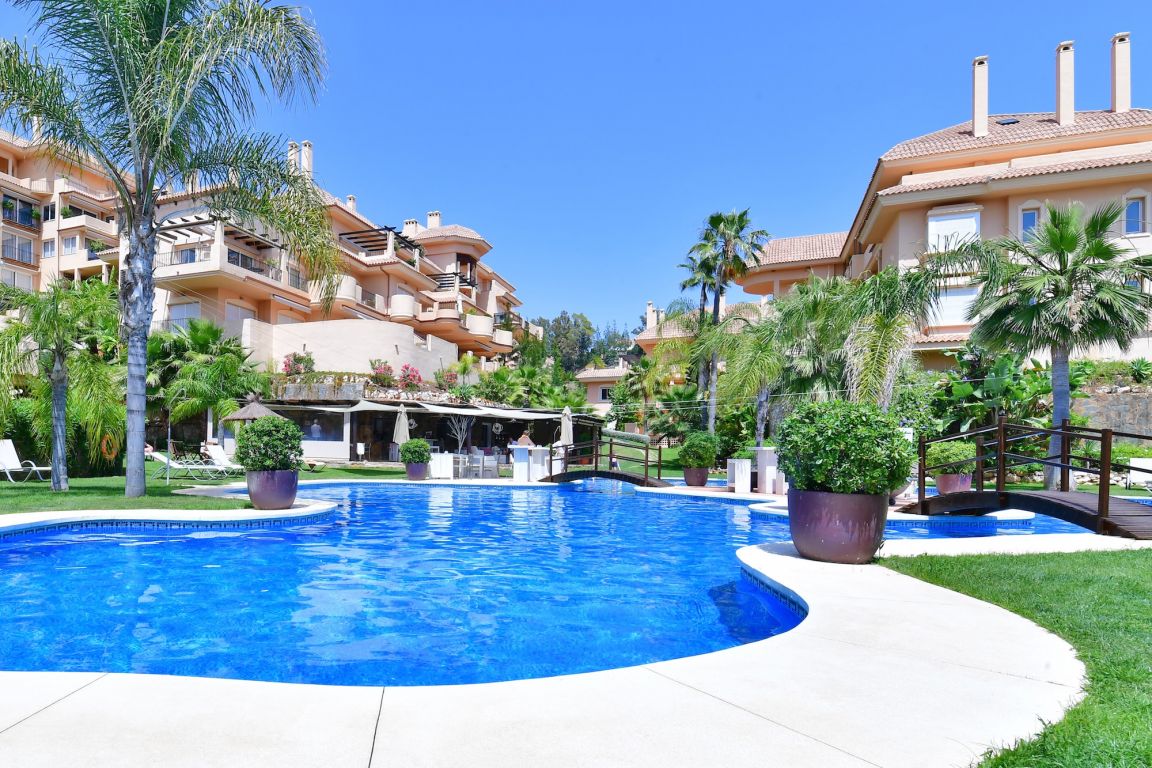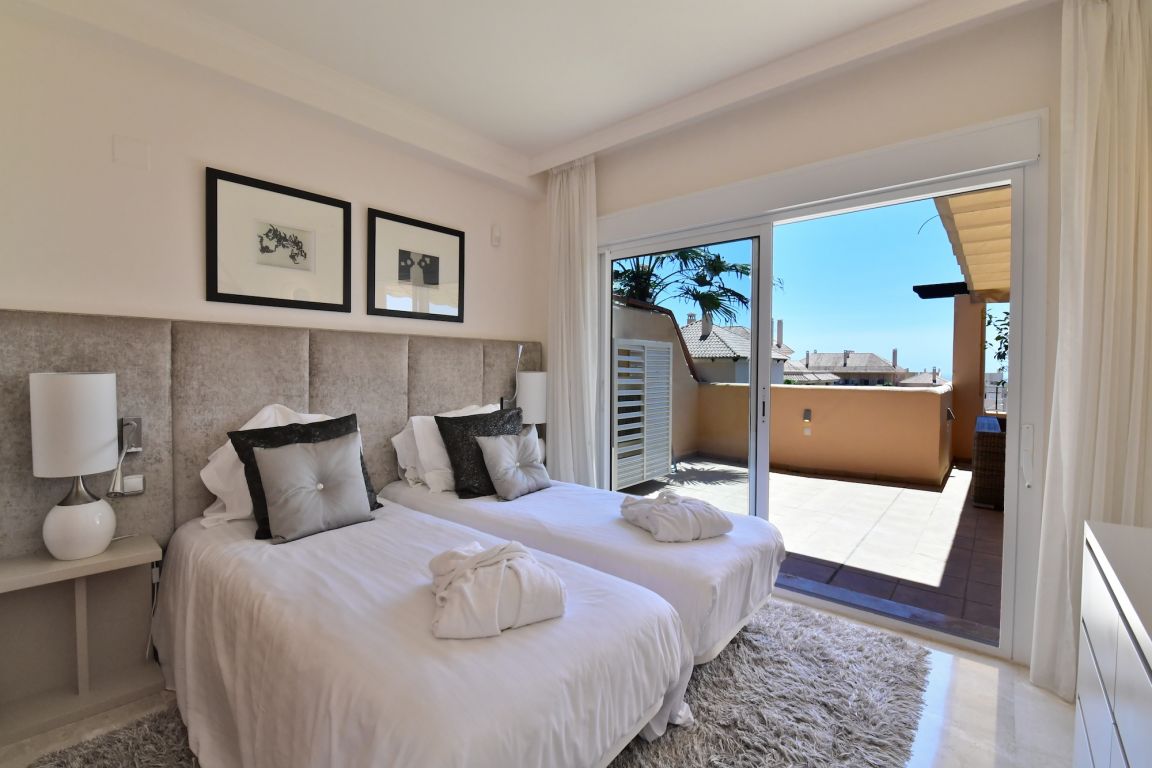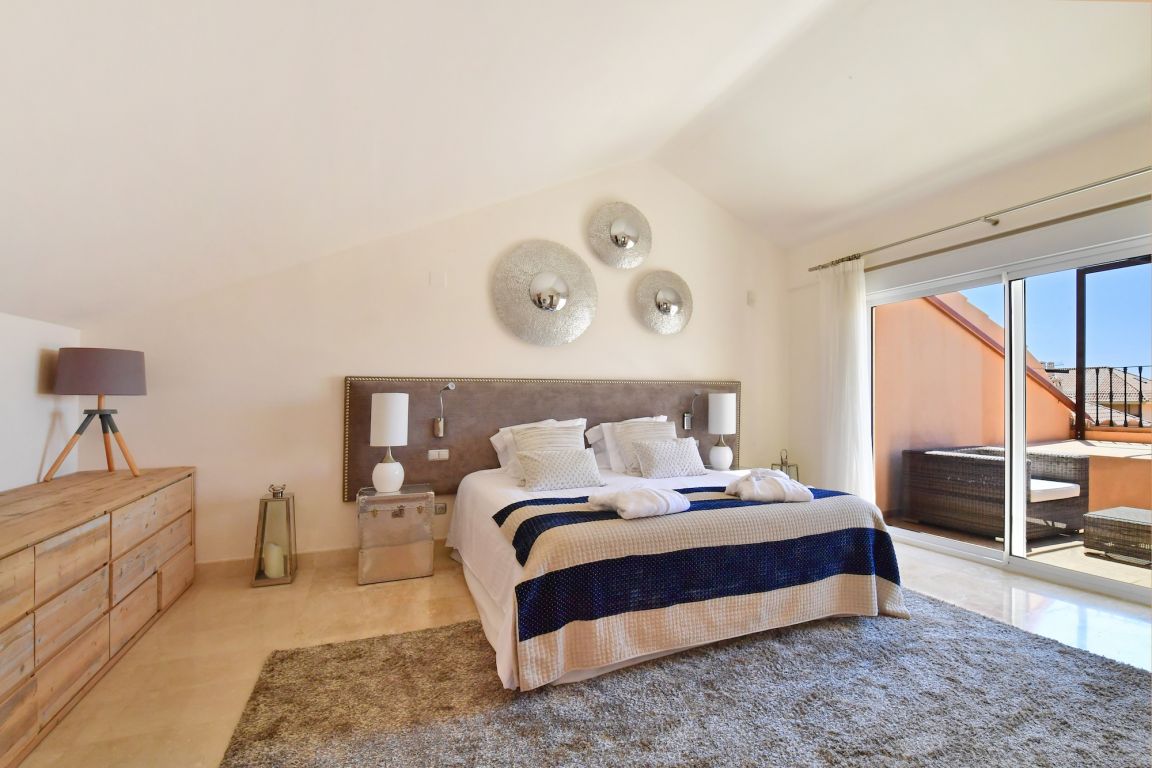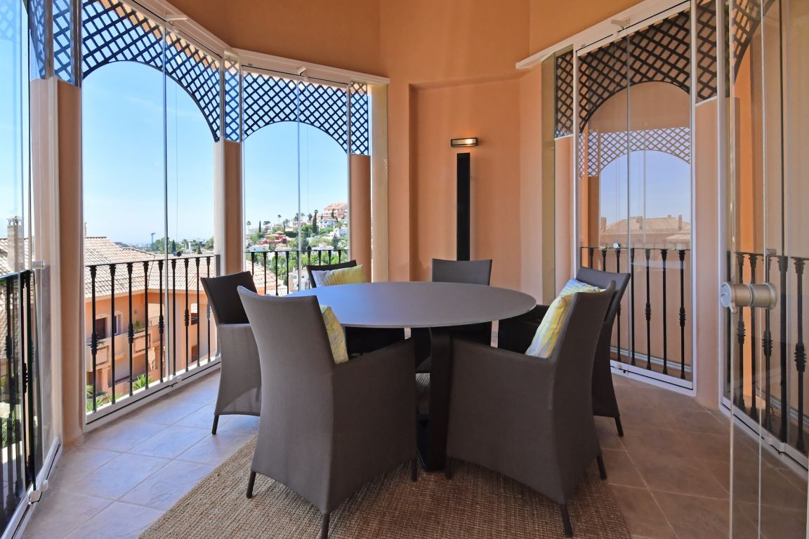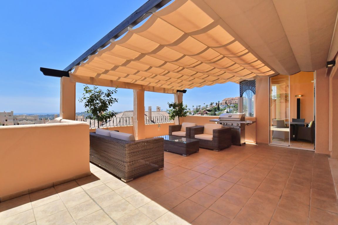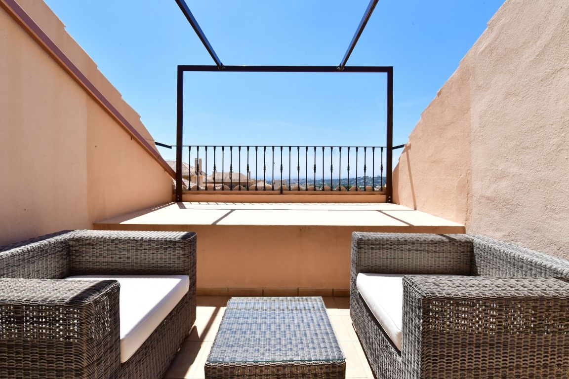 Excelente ático de dos dormitorios a la venta situado en el corazón de Nueva Andalucía en uno de los complejos más lujosos; Aloha Hill Club. Este complejo de alto estándar está rodeado de naturaleza, campos de golf y a sólo un corto trayecto en coche a todos los otros servicios como playa, escuelas, tiendas y restaurantes.. . El apartamento tiene un amplio y luminoso salón con chimenea que da a una gran terraza soleada con jacuzzi, vistas a la zona de la piscina, mar, África y Gibraltar. Adjunto a la terraza está el comedor separado con ventanas de cristal del suelo al techo. Una nueva cocina de estilo americano totalmente equipada, aseo de invitados, un dormitorio con vistas al mar y otro baño también se encuentran en la planta baja. Arriba está el dormitorio principal, muy amplio y luminoso con accedo a una segunda terraza con fantásticas vistas al mar.. . Aloha Hill Club ofrece una gama de instalaciones que incluyen spa, sauna, gimnasio, piscina cubierta climatizada, pistas de tenis y paddle, putting green, hermosas zonas verdes, un relajante bar- restaurante en la piscina. La urbanización tiene seguridad las 24 horas y también ofrece un servicio de conserje de cinco estrellas con servicios de limpieza y lavandería, entrega de compras, un club infantil, servicios de chef privado, tratamientos de spa, servicios de transporte, etc La propiedad también viene con aparcamiento subterráneo privado y trastero.