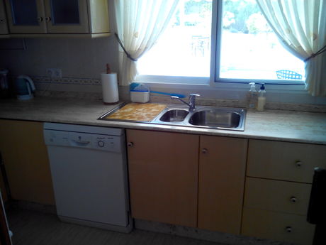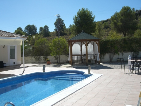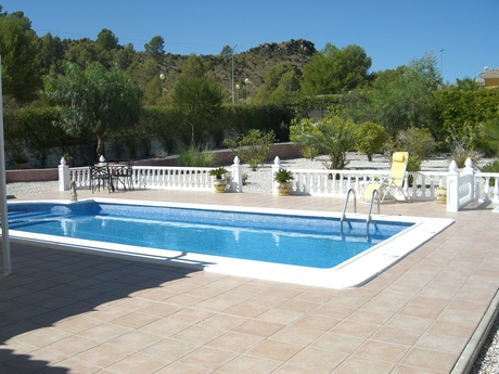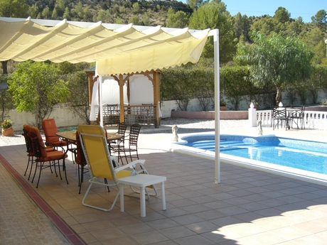 VENTA de bonita y acogedora casa muy bien conservada y en perfecto estado, ubicada en Urbanización Coto Riñales de Calasparra. Está distribuida toda en planta baja sobre una parcela de 1.250 m2 y consta de 3 dormitorios, 2 baños, cocina, salón-comedor, sala de estar, piscina con depuradora, cenador en el jardín, lavadero, trastero, zona de parking para el coche, etc.. Cuenta con calidades tales como calefacción con radiadores de gas propano, aire acondicionado frío/calor por conductos por toda la vivienda, portero automático, armarios empotrados, puerta automática con mando de entrada a la parcela, mosquiteras en todas las ventanas, pintura gotelé, etc... . NOTA: Los muebles no se incluyen en el precio, lo que sí se incluyen son los electrodomésticos.
