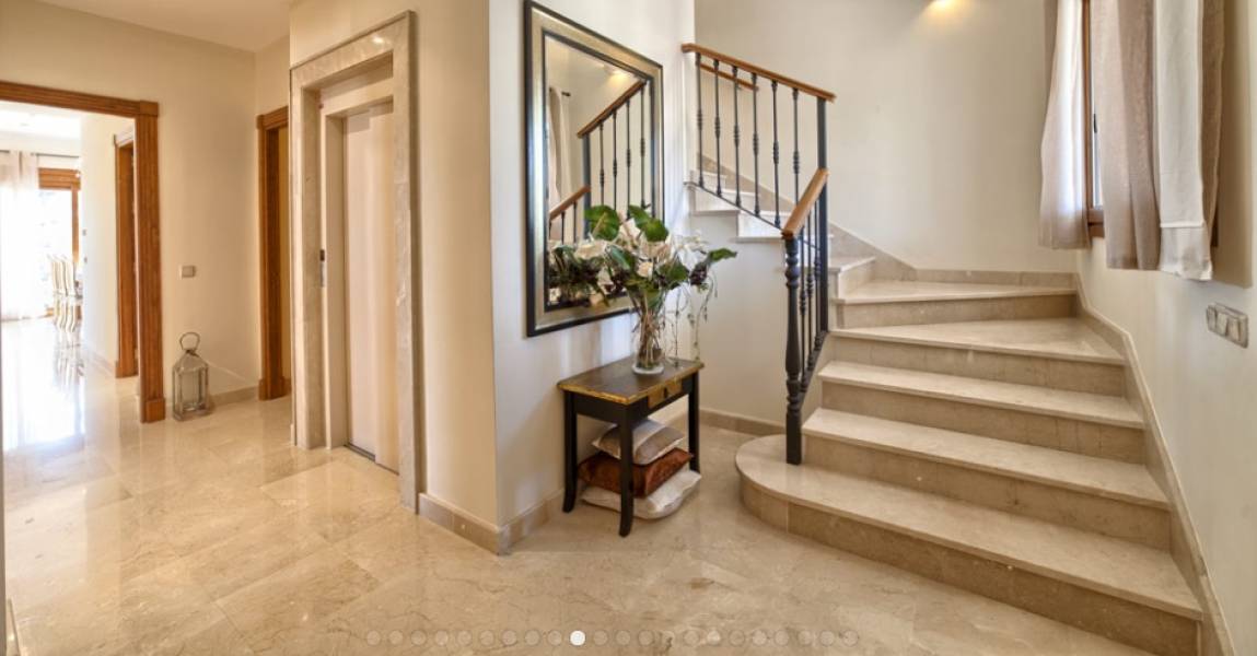 Bien situado villa de calidad con excelentes vistas sobre la costa y el mar. Sudoeste al orientada al oeste, cerca de todo. Planta principal: Salón comedor con techos altos y chimenea, cocina totalmente equipada, suite de un dormitorio de invitados (ahora se utiliza como comedor separado), aseo. Acceso directo a una terraza cubierta. Planta alta: dormitorio principal en suite y 2 dormitorios de invitados. Planta baja (nivel del jardín): dormitorio de invitados con cuarto de baño (o cuarto de servicio), el almacenamiento y garaje para 5 coches. acceso directo al jardín y piscina privada. Ascensor en todas las plantas.. . . Well located quality villa with great views over the Coast and the sea. Southwest to west facing, close to all amenities. Main floor: Living area with high ceilings and fireplace, fully fitted kitchen, one guest bedroom suite (now used as separate dining area), guest toilet. Direct access to a covered terrace. Upper floor: Master bedroom suite and 2 guest bedrooms suite. Lower floor (garden level): Guest bedroom with bathroom (or maids quarters), storage and big garage for 5 cars. Direct access to the private garden and pool area. Elevator to all floors. .