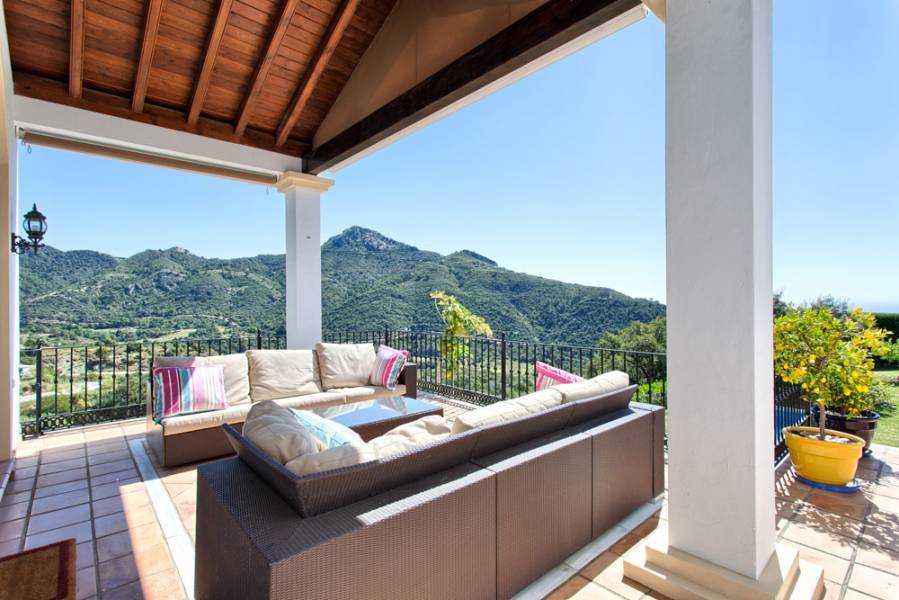 Villa Los Alcornoque. Monte Mayor, Benahavis. . Muy bien situado villa clásica de calidad con preciosas vistas al Mediterráneo y las montañas. Muy tranquila y privada, al sur con orientación este. Planta principal: Salón comedor con chimenea y acceso directo a la terraza, comedor, cocina totalmente equipada, oficina y un dormitorio para invitados. Las plantas inferiores - el nivel de jardín: dormitorio principal en suite y dos dormitorios de invitados. zona de ocio con posibilidad de un dormitorio adicional. Doble garaje. Jardín privado con piscina climatizada. A sólo 15 minutos de tod... Leer más