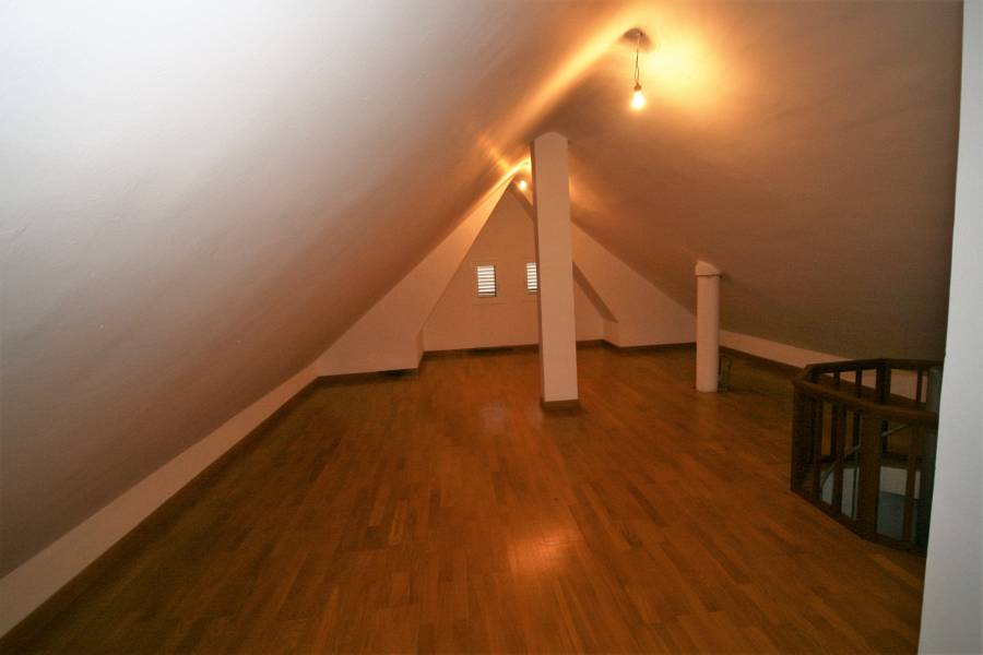Bonito chalet independiente de tres plantas sobre una parcela de 575 m2 que se distribuye en planta baja con salón comedor en dos ambientes con chimenea, una habitación que se puede utilizar como despacho, un aseo y cocina amueblada desde la que se sale a una zona acristalada que se puede utilizar como comedor o zona de reposo. En la primera planta tres dormitorios dobles con armarios empotrados y dos baños completos, uno de ellos dentro del dormitorio principal. La tercera planta es una buhardilla a la que se accede por una escalera de caracol que se puede usar como dormitorio, cuarto de juegos o zona de descanso. Toda la casa tiene suelo de parquet y cristales dobles. En el exterior hay una zona destinada a jardín y garaje cubierto para tres coches que tiene encima una gran terraza. Un segundo garaje se encuentra habilitado como zona de celebraciones con cocina y barbacoa con capacidad para más de 30 personas, de fácil acceso y con buena luz. Todo el jardín está equipado con riego automático. Se encuentra en buenas condiciones. Cerca del campus de Guajara y de centros comerciales con fácil acceso a la autopista. Venga a verlo