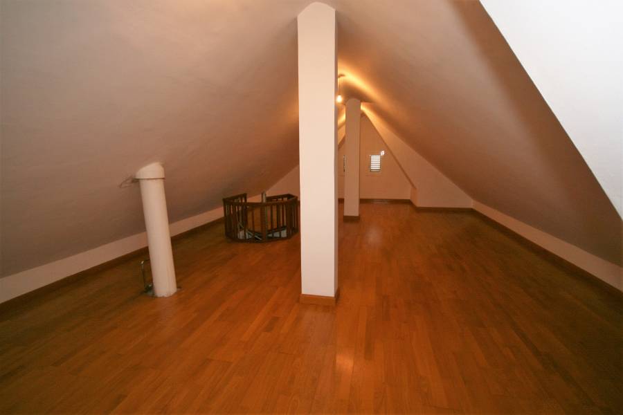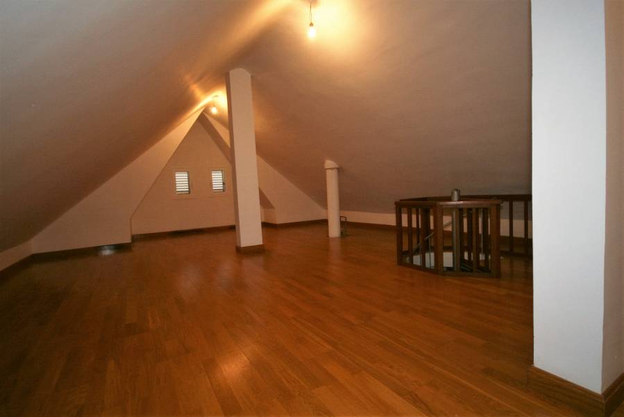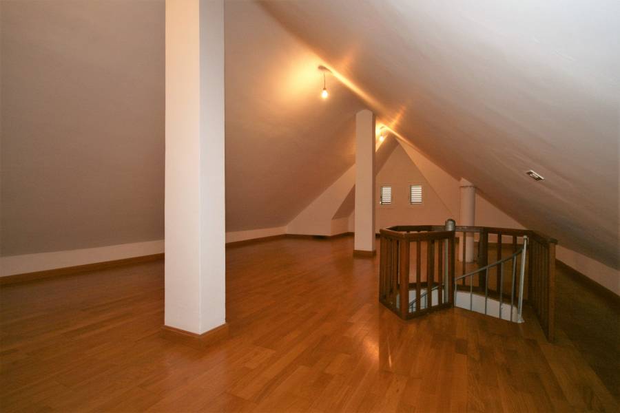 Bonito chalet independiente de tres plantas sobre una parcela de 575 m2 que se distribuye en planta baja con salón comedor en dos ambientes con chimenea, una habitación que se puede utilizar como despacho, un aseo y cocina amueblada desde la que se sale a una zona acristalada que se puede utilizar como comedor o zona de reposo. En la primera planta tres dormitorios dobles con armarios empotrados y dos baños completos, uno de ellos dentro del dormitorio principal. La tercera planta es una buhardilla a la que se accede por una escalera de caracol que se puede usar como dormitorio, cuarto de j... Leer más