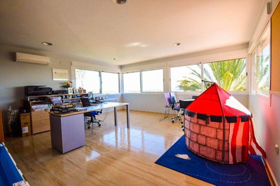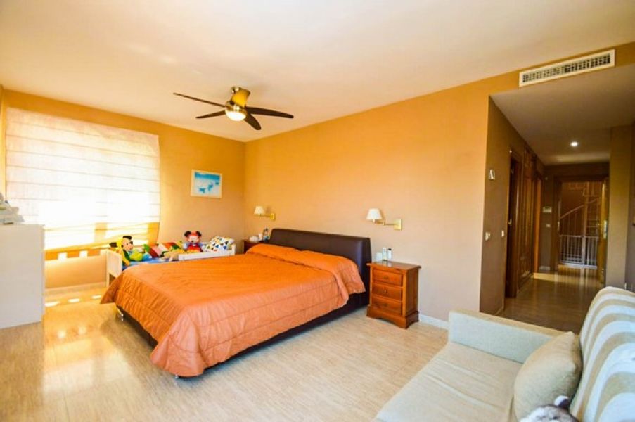 Moderna Villa con apartamento independiente, vistas al mar y construida con materiales de alta calidad en zona exclusiva y segura pero a corta distancia a todos los servicios.. . Se distribuye en 3 plantas de la siguiente manera:. Planta baja: Porche de entrada, elegante hall y corredor, cocina independiente totalmente equipada con mesa comedor. Amplio salón comedor con chimenea, pantalla de cine y acceso al porche con preciosas vistas abiertas al mar, ciudad de Málaga y montañas. Dormitorio con armario empotrado y baño. Garaje con portón automático para 2 vehículos. Amplio porche con zona de sentar y mesa comedor.. Planta alta: 3 dormitorios dobles con armarios empotrados y 2 baños. (Dormitorio principal con baño en suite y vestidor). Habitación de masajes y amplia y luminosa oficina (pudiendo ambas convertirse en dormitorios).. Semi-sótano: Sala de juegos, gimnasio, trastero y cuarto de máquinas con aljibe.. Apartamento independiente con amplio salón comedor, cocina equipada e integrada al salón. Dormitorio doble con escritorio, vestidor y baño.. . Exterior: Preciosa jardín de fácil mantenimiento con sistema de riego automático, zona de barbacoa junto a la piscina con jacuzzi y 100% de privacidad.. . Propiedad en excelentes condiciones con ventanas de doble acristalamiento, aire acondicionado frío calor en toda la casa, armarios empotrados, sistema de alarma..