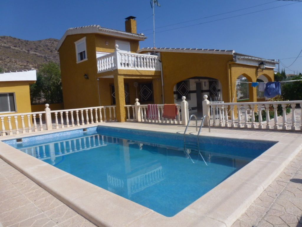 Chalet independiente de 2 plantas a poca distancia del pueblo de Hondón de las Nieves, Alicante. Orientación sur, increíbles vistas a la montaña. Piscina privada. Cochera Parilla. La casa consta de 4 dormitorios, 1 baño, salón con chimenea, cocina independiente. Porche cubierto en la planta baja y una terraza soleada en el primer nivel. En el exterior hay un almacenamiento masivo con baño que podría ser fácilmente convertido en un alojamiento. La propiedad tiene agua y electricidad. Internet. Hermosa parcela totalmente vallada con olivos y árboles frutales.
